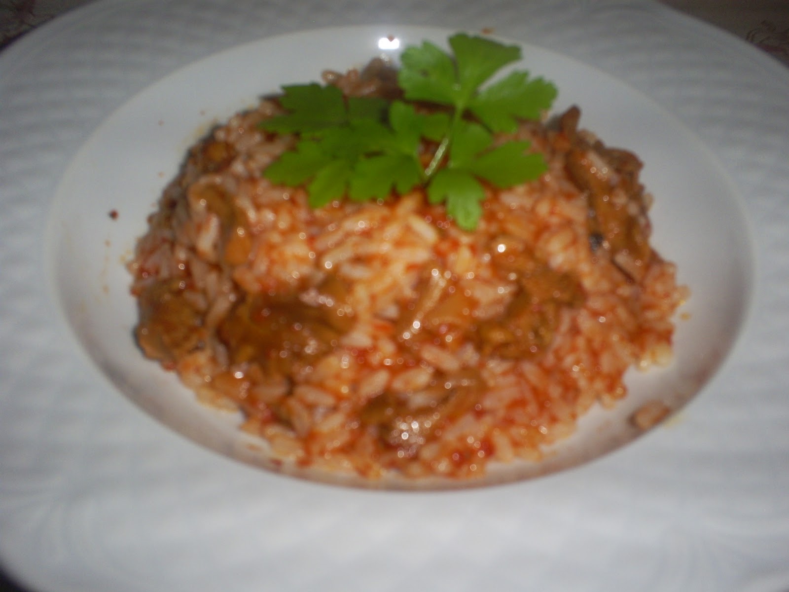 Pulire e lavare i funghi e lasciarli scolare un po',perché tendono ad assorbire molta acqua.Nel frattempo preparare il soffritto con olio,aglio, prezzemolo e peperoncino far soffriggere un attimo e aggiungere i funghi farli insaporire e aggiungere la polpa di pomodoro salare e far cuocere per 20 minuti più o meno senza aggiungere acqua perché na rilasciano un po' loro. Mentre il sugo è a fine cottura,cuocere il riso e quando è pronto scolarlo e versarlo nella pentola del sugo mescolare,aggiungere prezzemolo tritato e servire nei piatti BUON APPETITO.